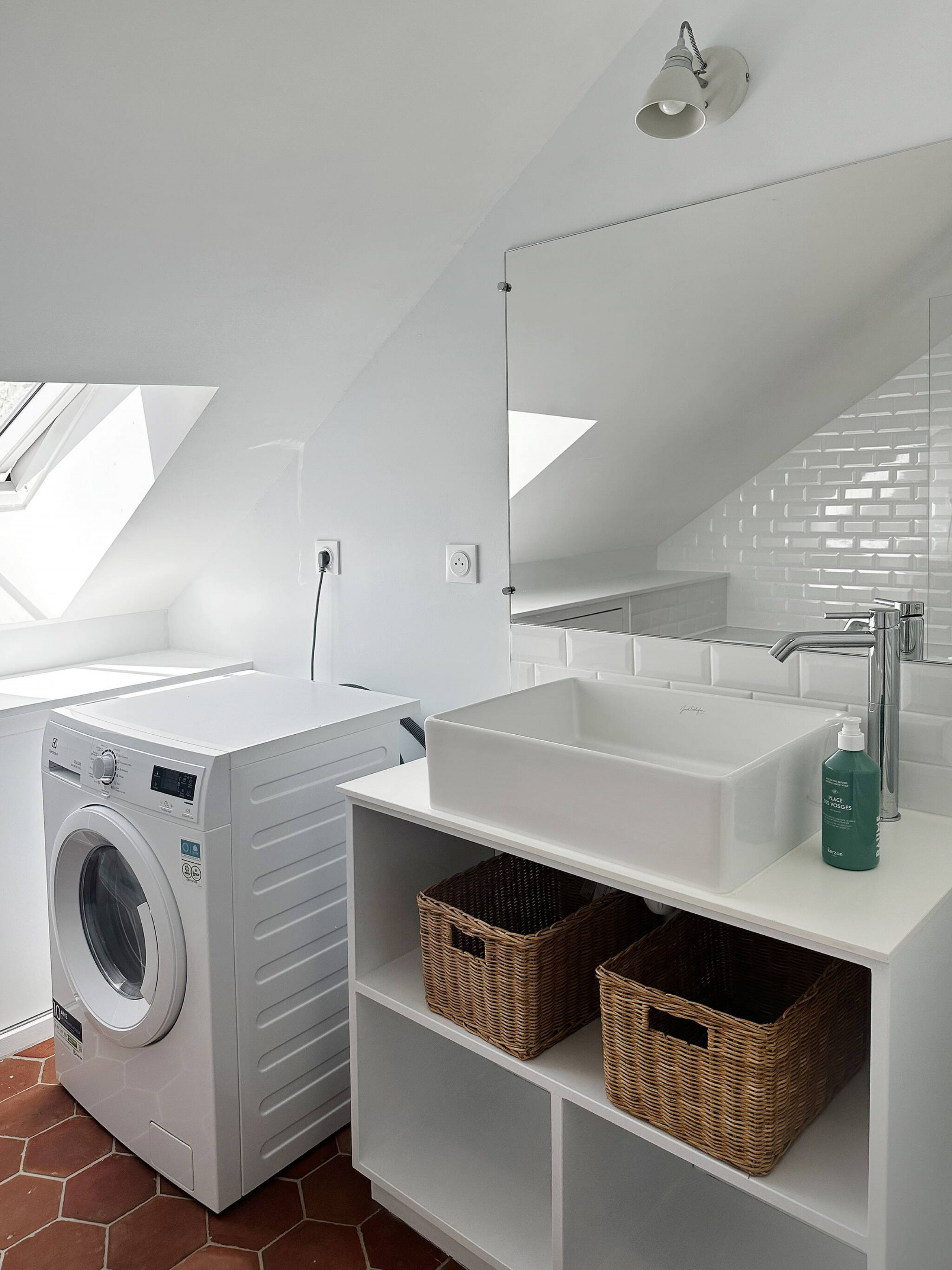 A large bathroom equipped with a washing machine and tumble dryer.