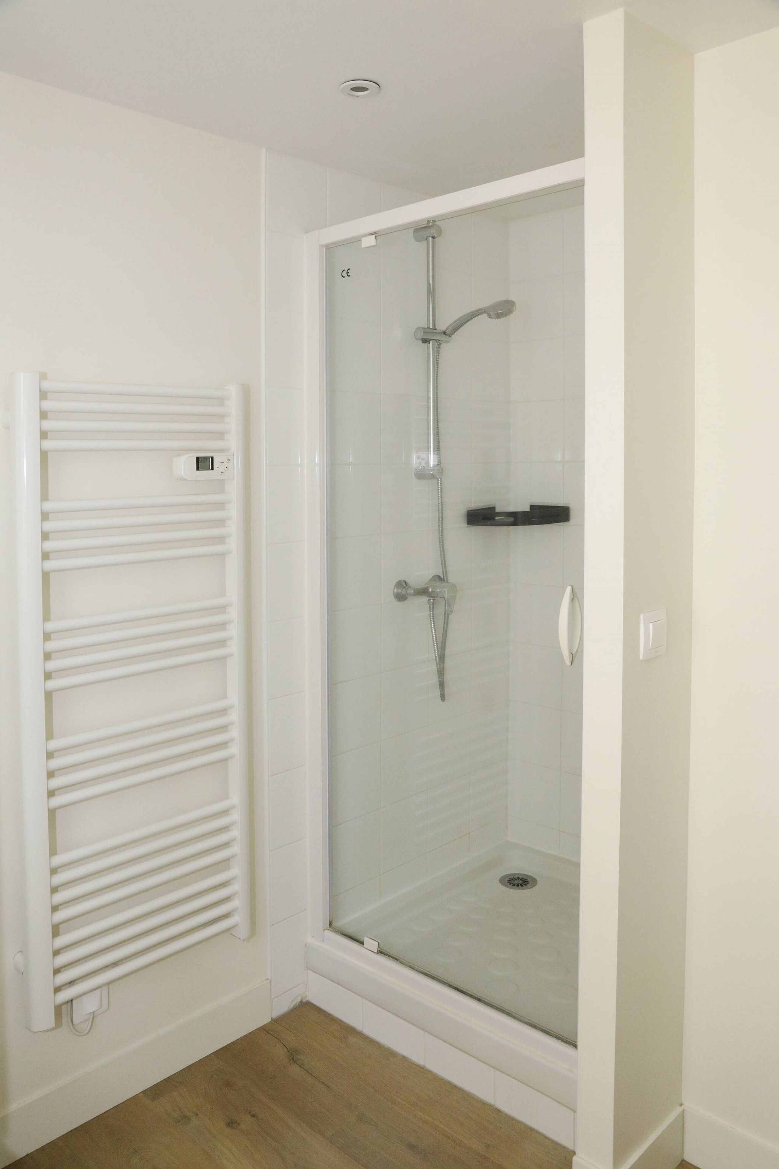 Une grande salle de bain équipée d'un lave linge et sèche linge.